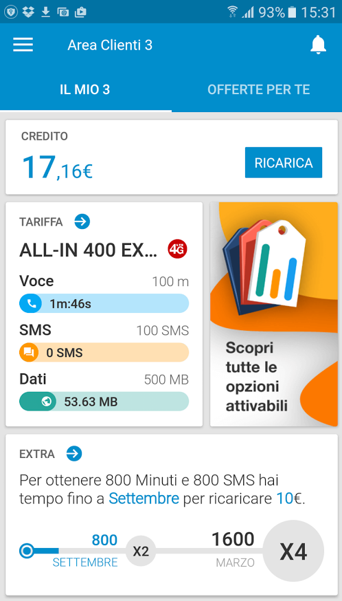 Dal MIO TRE gestisci la tua SIM accedendo in modo immediato ai contatori, all’offerta attiva, al servizio di ricarica e ai programmi GrandeCinema 3 e Payback.
