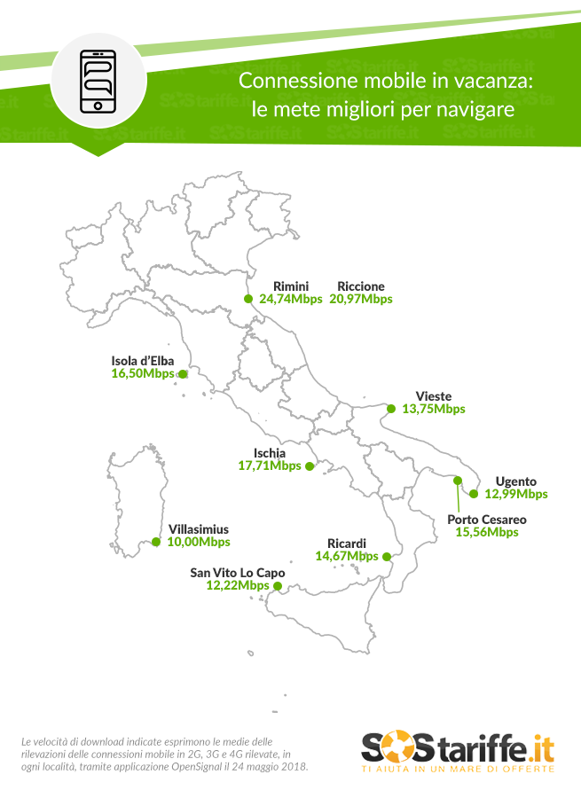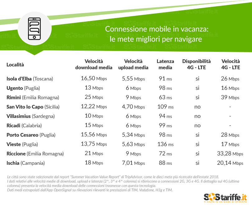 Lo studio, condotto a luglio 2018 grazie all’app Open Signal Maps, ha permesso di esaminare in dettaglio la copertura 2G, 3G e 4G, la velocità di connessione e i tempi di latenza media dei quattro principali operatori italiani (TIM, Vodafone, H3g e Wind) nelle località estive più gettonate di quest’estate individuate dal report “Summer Vacation Value” di TripAdvisor. Le mete finite sotto la ‘lente’ di SosTariffe.it sono dieci: l’isola d’Elba in Toscana, Ugento, Porto Cesareo e Vieste in Puglia, Rimini e Riccione in Emilia Romagna, Ischia in Campania, Ricadi in Calabria, e infine la siciliana San Vito lo Capo e la sarda Villasimius. Ricordiamo che oggetto dell’osservatorio è la valutazione delle performance delle sole reti Internet mobili, quindi sono escluse rilevazioni e considerazioni riguardanti il servizio di telefonia.