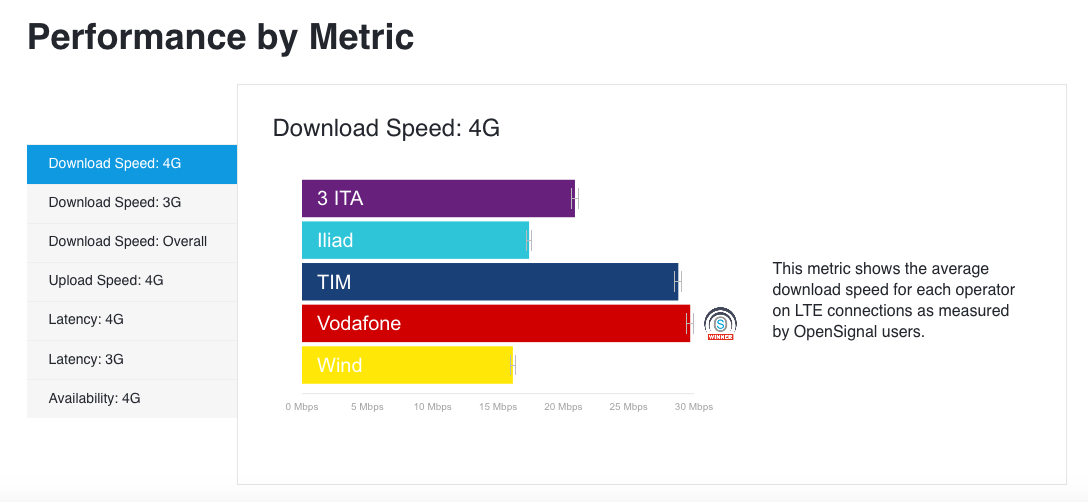 Vodafone ha dominato nella velocità, ottenendo i riconoscimenti di Open Signal per i valori di download in 4G, nel download complessivo e per l’upload 4G. Tuttavia, le misurazioni mostrano che la velocità media di download 4G di Vodafone è diminuita significativamente di oltre 4 Mbps (ora è pari a 29,7 Mbps), consentendo a TIM di colmare il divario.